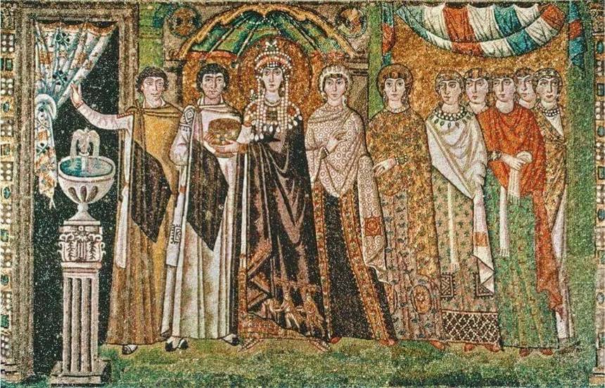 Mosaïque de l’impératrice Théodora et les accompagnateurs (sur un des côtés de l’abside), Basilique de San Vitale (VIe s.), AD547, mosaïque de Ravenne, Émilie-Romagne, Italie. La basilique de style byzantin, est un rare témoignage de la période justinienne.